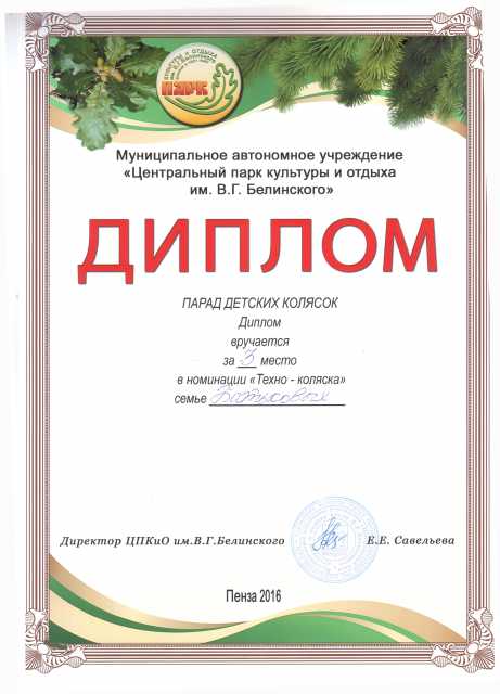 Парад колясок15 мая семья Батьковых приняла участие в городском семейном конкурсе «Парад детских колясок», который проходил в ЦПКиО им. В.Г. Белинского. Мероприятие было приурочено ко Дню семьи и 195 – летию парка. Конкурсанты соревновались в шести номинациях. Коллектив выражает искреннюю признательность и благодарность семье Батьковых за активное участие и победу в конкурсе «Парад детских колясок». Желаем Вам доброго здоровья, благополучия, счастья, любви и вдохновения! Надеемся на дальнейшее плодотворное сотрудничество!