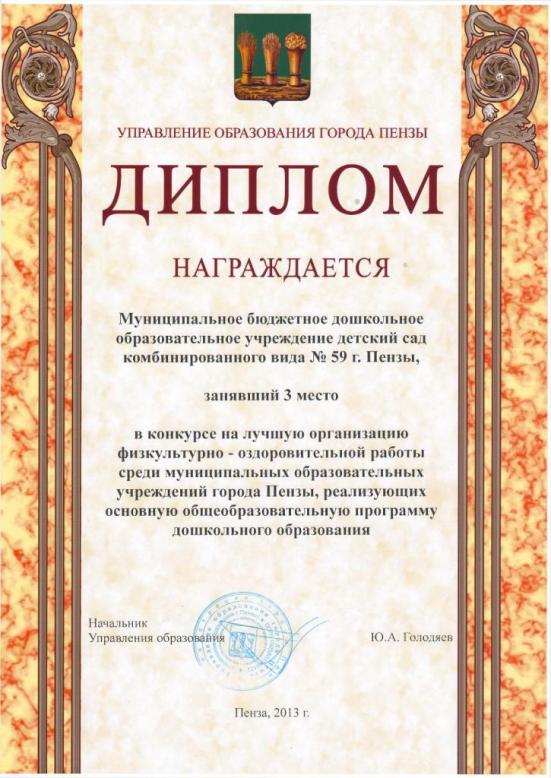 В октябре 2013 года детский сад принял участие в городском конкурсе на лучшую организацию физкультурно – оздоровительной работы среди муниципальных образовательных учреждений города Пензы, реализующих основную общеобразовательную программу дошкольного образования. По итогам конкурса детский сад занял III место и награжден ДИПЛОМОМ. На конкурс был представлен педагогический проект «Малые олимпийские игры». ЦЕЛЬ ПРОЕКТА: привлечь внимание воспитанников, их родителей и сотрудников МБДОУ № 59 к Олимпийским играм. Развлечения «Осень в гости к нам пришла»25, 30, 31 октября в детском саду и группе (расположенной в МОУ СОШ № 62) прошли осенние развлечения «Осень в гости к нам пришла». В гости к детям пришли яркие и веселые персонажи. Осенние хороводы, игры с зонтиком, грибами, огородные частушки, игра на музыкальных инструментах, чтение стихов — все это веселило и радовало детей и дало им большой заряд бодрости и хорошего настроения на весь день. В конце развлечений, как всегда – угощения от щедрого урожая Осени – румяные яблоки и сочные груши для всех детей и веселая дискотека. Младший дошкольный возраст